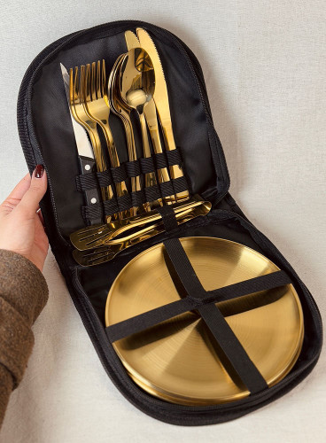 ست ظروف مسافرتی طلایی کیف دار ۲ نفره