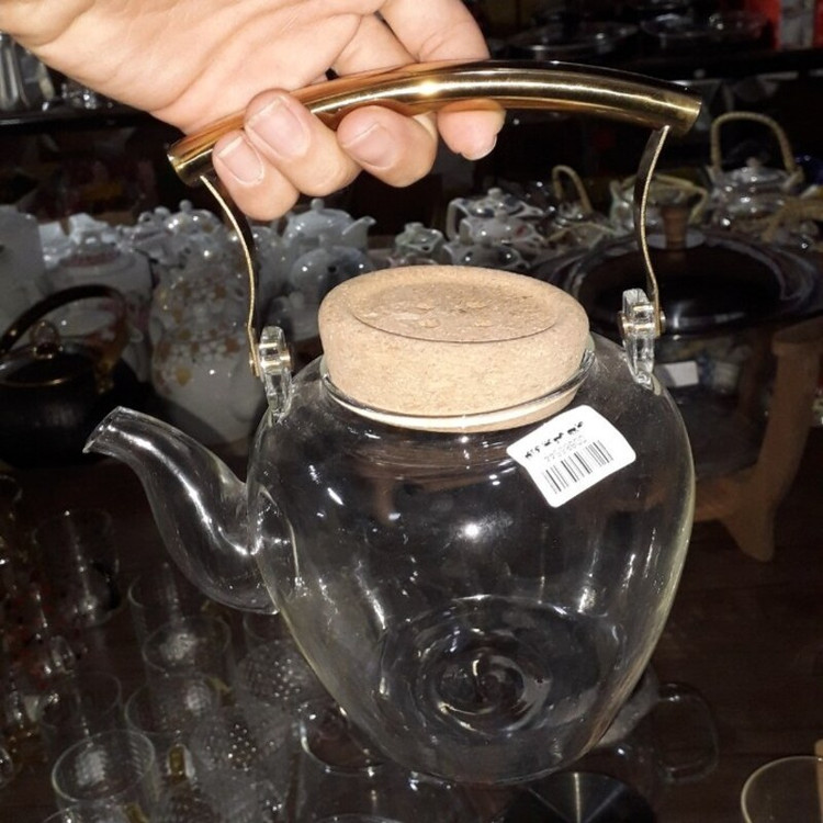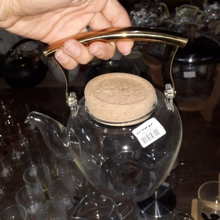 قوری پیرکس دسته طلایی درب چوبی دکمه ای
