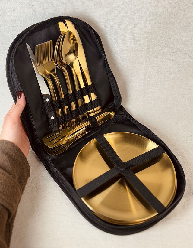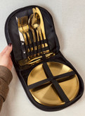 ست ظروف مسافرتی طلایی کیف دار ۲ نفره