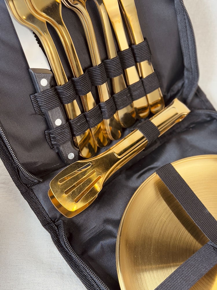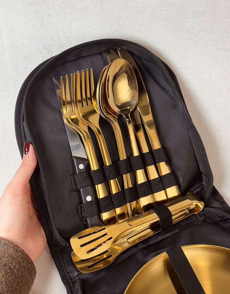 ست ظروف مسافرتی طلایی کیف دار ۲ نفره